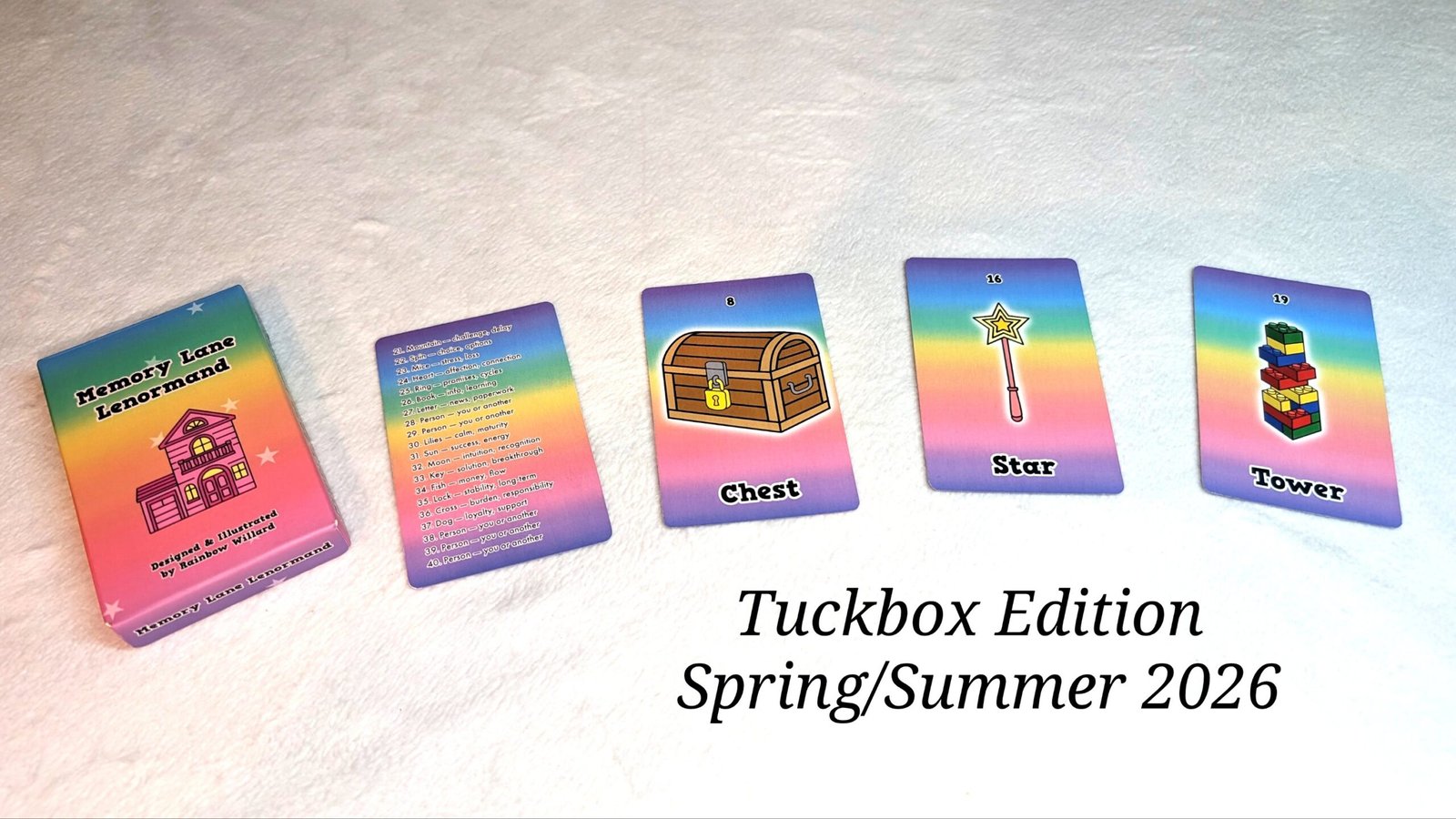 The current (Winter) Memory Lane Lenormand is a soft pastel edition with a fold-out guide. When this sells out, the Spring/Summer tuckbox edition will be stocked.